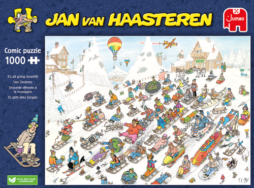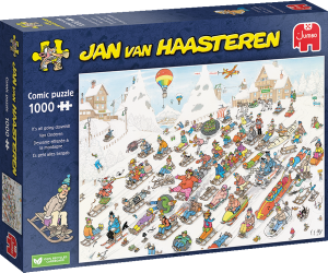 Skládání puzzle od Jana van Haasterena je velmi pestré a zábavné, prozkoumáte tak každý vtipný detail a zabavíte se na dlouhé chvíle. V souladu se svými tradicemi komponuje Jan van Haasteren do svých předloh svoji známou značku, kterou jako první jeho fanoušci hledají - žraločí ploutev a ruce, které vypadají, jako by nikomu nepatřily! A také mnoho dalších detailů, které naleznete na téměř všech jeho ilustracích - zubní protézu, Mikuláše a Haasterenův vlastní portrét. Velmi detailní, barevné a především vtipné ilustrace od autora jménem Jan Van Haasteren výhradně pro JUMBO. Jeho kresby mají výrazně rozeznatelný styl - vtipné obrázky, veselé situace a daleko více lidí, než byste očekávali! Puzzle z produkce Jan van Haasteren jsou po celém světě populární a doposud jich vytvořil více než 80. Ilustrační video Rozměr složeného puzzle cca 68 x 49 cm