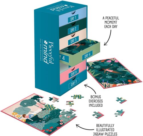 Vyhraďte si každý den 20 minut a složte si jeden motiv denně po dobu 6 dnů. Poslední den si užijte překvapivé odhalení puzzle, cvičení mindfulness a relaxační omalovánky. Skládání puzzle může snížit stres, zlepšit koncentraci a zlepšit náladu.