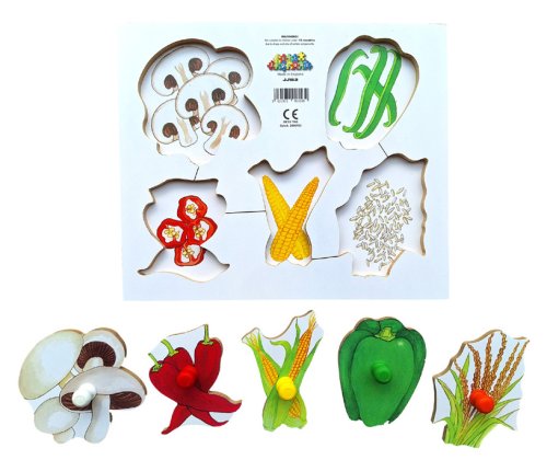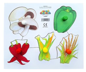 Just Jigsaws 153 Loupeme a krájíme plodiny 4 - dřevěné deskové puzzle 6 dílů představuje dřevěnou skládačku s kolíčky pro snadný úchop, která dětem krásně znázorňuje, jak vypadá zelenina, houby, kukuřice a rýže i pod svojí slupkou. Cílem této skládačky je, aby děti správně přiřadily zeleninu, houby, kukuřici a rýži k jejich nakrájené nebo vyloupané variantě. S tímto naučným puzzle si děti osvojují názvy různých druhů plodin, jejich barvy a tvary. Samotná hra zároveň pozitivně ovlivňuje rozvoj logického myšlení a formování prostorové představivosti, což z této na první pohled obyčejné skládačky dělá velmi zajímavou a edukativní hru. Sada obsahuje: žampiony, papriku sladkou, chilli papričky, kukuřici a rýži.