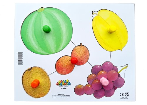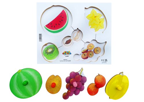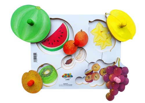 Just Jigsaws 155 Loupeme a krájíme plodiny 6 - dřevěné deskové puzzle 6 dílů představuje dřevěnou skládačku s kolíčky pro snadný úchop, která dětem krásně znázorňuje, jak vypadá exotické ovoce i pod svojí slupkou. Cílem této skládačky je, aby děti správně přiřadily ovoce k jeho nakrájené variantě. S tímto naučným puzzle si děti osvojují názvy různých druhů exotického ovoce, jejich barvy a tvary. Samotná hra zároveň pozitivně ovlivňuje rozvoj logického myšlení a formování prostorové představivosti, což z této na první pohled obyčejné skládačky dělá velmi zajímavou a edukativní hru. Sada obsahuje: hrozny, kiwi, meloun, karambolu a liči.