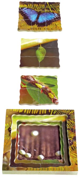 Just Jigsaws 601 Motýl a jeho životní cyklus - dřevěné vrstvené puzzle 19 dílů. Objevujte s tímto netradičním puzzle životní cyklus motýla. Edukativní puzzle, díky kterému mohou děti zkoumat zázračné proměny přírody prostřednictvím skutečných fotografií. Vrstvené puzzle obsahuje obrázky 4 fází vývojového cyklu. K vidění jsou reálné fotky: vajíček, housenky, počátku kuklení a dospělého motýla. Sada obsahuje celkem 18 kusů puzzle dílků a 1 základnu s rámečkem.