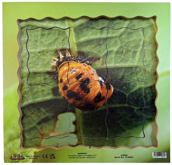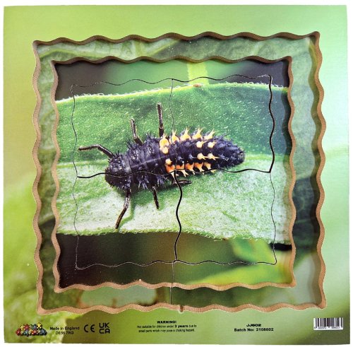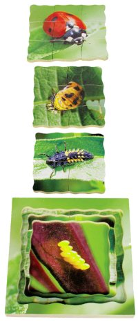 Just Jigsaws 602 Beruška a její životní cyklus - dřevěné vrstvené puzzle 19 dílů. Objevujte s tímto netradičním puzzle životní cyklus berušky. Edukativní puzzle, díky kterému mohou děti zkoumat zázračné proměny přírody prostřednictvím skutečných fotografií. Vrstvené puzzle obsahuje obrázky 4 fází vývojového cyklu. K vidění jsou reálné fotky: vajíček, larvy, kukly a dospělého slunéčka sedmitečného. Sada obsahuje celkem 18 kusů puzzle dílků a 1 základnu s rámečkem.