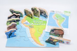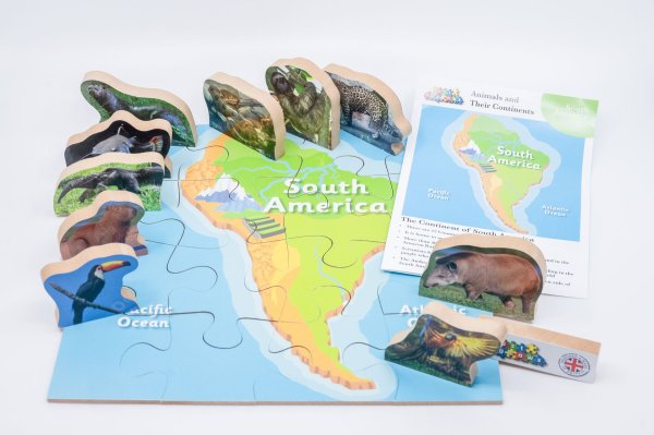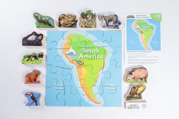 Just Jigsaws 772 Jižní Amerika a její zvířata - dřevěné puzzle 16 dílů a 10 zvířat je vzdělávací sada, jejímž smyslem je seznámit děti s jednotlivými kontinenty a jejich faunou. Cílem je správně poskládat mapu daného světadílu a pojmenovat všechna zvířata, která na něm žijí. Sada obsahuje 10 reálně vyobrazených, volně stojících zvířat na MDF desce o tloušťce 1,5 cm, 1 mapu kontinentu na MDF desce o tloušťce 0,4 cm rozřezanou na 16 kusů a informační list s jednoduchými vysvětlujícími informacemi o daném světadíle a některých jeho zvířatech. Toto edukativní puzzle je skvělou volbou pro všechny, kteří mají rádi přírodu a zároveň děti chtějí hravým způsobem připravit na budoucí hodiny zeměpisu.