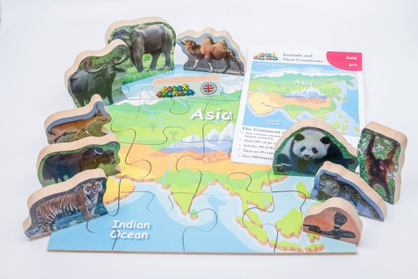 Just Jigsaws 773 Asie a její zvířata - dřevěné puzzle 16 dílů a 10 zvířat je vzdělávací sada, jejímž smyslem je seznámit děti s jednotlivými kontinenty a jejich faunou. Cílem je správně poskládat mapu daného světadílu a pojmenovat všechna zvířata, která na něm žijí. Sada obsahuje 10 reálně vyobrazených, volně stojících zvířat na MDF desce o tloušťce 1,5 cm, 1 mapu kontinentu na MDF desce o tloušťce 0,4 cm rozřezanou na 16 kusů a informační list s jednoduchými vysvětlujícími informacemi o daném světadíle a některých jeho zvířatech. Toto edukativní puzzle je skvělou volbou pro všechny, kteří mají rádi přírodu a zároveň děti chtějí hravým způsobem připravit na budoucí hodiny zeměpisu.