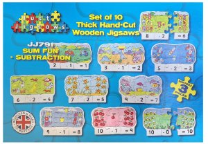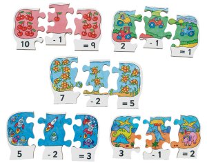 Just Jigsaws 791 Odčítání - dřevěné puzzle 30 dílů. Tato dřevěná matematická skládačka pomůže dětem procvičit jednoduché počty zábavnou formou. Nabízí 10 matematických úloh na odčítání. Na každém dílku jsou nakresleny obrázky odpovídající numerickému číslu v jeho spodní části. Úkolem je sestavit vždy k sobě 3 díly tak, aby vznikl správný výsledek. Skvělý úvod do jednoduché matematiky. Sada obsahuje 10 x 3 díly.