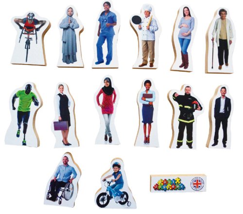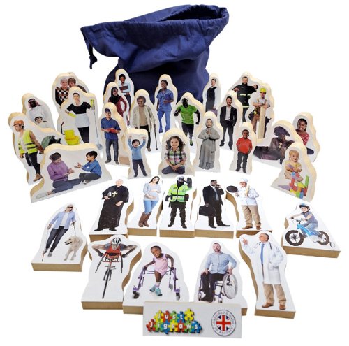 Just Jigsaws 831 Lidé kolem nás - dřevěné postavy 33 dílů je sada 33 reálně vyobrazených, volně stojících postav představující lidskou populaci. Sada nabízí široké spektrum, zahrnující různé věkové kategorie a pohlaví, hendikepované jedince, zástupce různých národností, kteří odrážejí naši bohatou kulturu a v neposlední řadě představuje i různé profese. Tato sada je krásnou edukativní pomůckou a najde různé způsoby využití. Reálné fotky těchto lidí z běžného života pomáhají dětem lépe identifikovat určité postavy a snáze si je pak zapamatovat. Výška dřevěných figurek se pohybuje mezi 7,5 cm a 10,5 cm a jsou vyrobeny z MDF desky o tloušťce 1,5 cm.