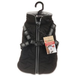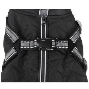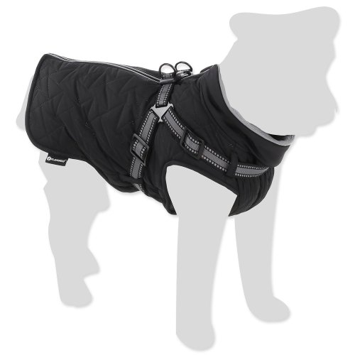 integrovaný postroj s reflexními proužky, prošívaný voděodolný materiál, příjemná fleecová podšívka, pohodlné zapínání na hřbetě psa.