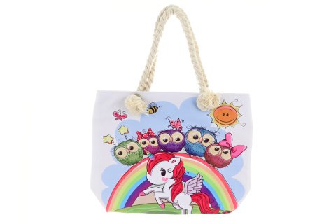 Kabelka přes rameno s motivem jednorožce a soviček. Zadní strana látková, přední strana lesklá (koženka). Rozměry kabelky 28x22 cm. Baleno v sáčku. Výrobek není hračka.