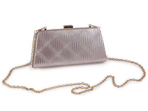 Malá společenská kabelka vyzařuje eleganci a luxus, má zajímavou lesklou povrchovou strukturu, efektně se třpytí. Zdobí ji výrazné lesklé zapínání a rámeček po celém obvodu. Kabelka je pevně vyztužená, její součástí je dlouhý odnímatelný řetízek na karabiny. Můžete ji nosit v ruce nebo jako crossbody přes rameno či do kříže.