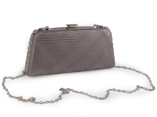 Malá společenská kabelka vyzařuje eleganci a luxus, má zajímavou lesklou povrchovou strukturu, efektně se třpytí. Zdobí ji výrazné lesklé zapínání a rámeček po celém obvodu. Kabelka je pevně vyztužená, její součástí je dlouhý odnímatelný řetízek na karabiny. Můžete ji nosit v ruce nebo jako crossbody přes rameno či do kříže.