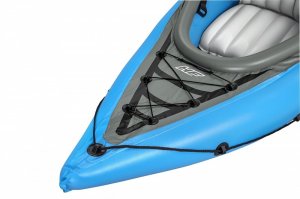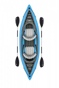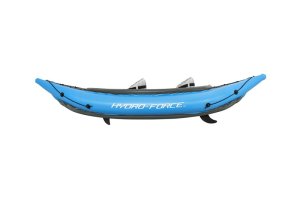 Kajak Hydro Force™ Cove Champion™ X2 je ideální volbou pro pohodové vodní dobrodružství na jezeře, řece i moři. Tento dvoumístný nafukovací kajak se snadno a rychle připraví k použití. Tři vzduchové komory zvyšují bezpečnost a stabilitu, zatímco promyšlený tvar a uzavřený kokpit minimalizuje pronikání vody dovnitř a zlepšuje celkový zážitek z jízdy. Odolný materiál Inflata-Shield™ zajišťuje vyšší pevnost, omezuje nadměrné roztahování a zvyšuje odolnost proti poškození. Komfortní kokpit je vybaven dvěma nafukovacími sedadly s opěrkou zad pro pohodlnou jízdu. Praktický úložný prostor se síťkou poskytuje dostatek místa na drobnosti a vybavení. Certifikace GS od TÜV SÜD potvrzuje splnění vysokých bezpečnostních standardů pro bezstarostnou zábavu na vodě. Nechybí ani odnímatelné ploutve pro lepší směrovou stabilitu, madla pro snadné přenášení a ventily pro rychlé nafouknutí i vyfouknutí. Součástí balení je 1 pár hliníkových pádel o délce 230 cm, ruční pumpa Air Hammer™, transportní taška a opravná sada – vše, co potřebujete pro okamžité vyplutí. Pro 2 osoby. Maximální nosnost 220 kg. Rozměry v nafouknutém stavu: 45 x 88 x 331 cm. Rozměry ve vyfouknutém stavu: 91 x 331 cm. Rozměry balení: 58 x 45 x 24,5 cm.