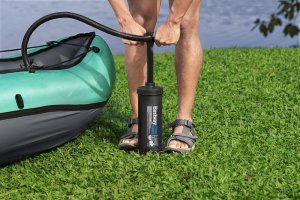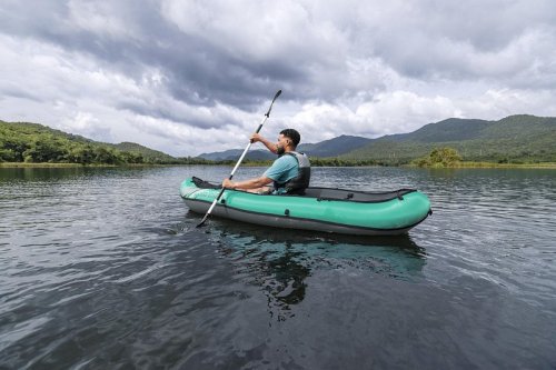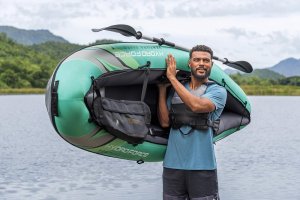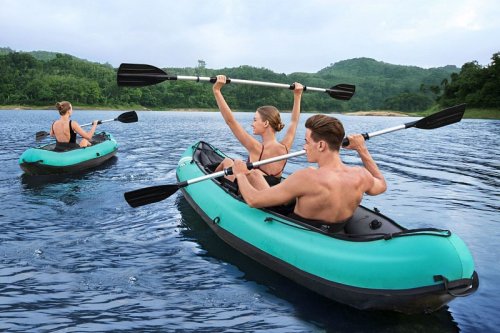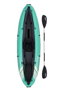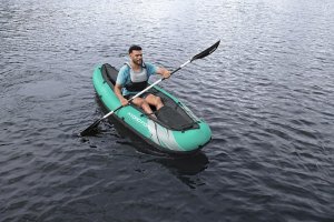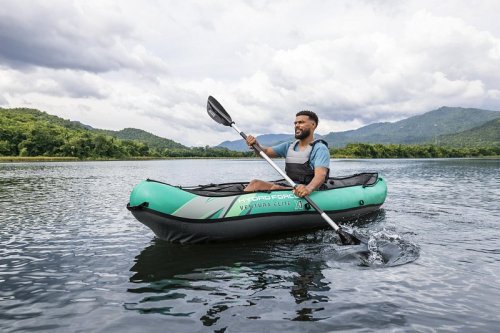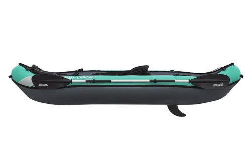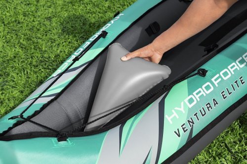 Bestway® Kajak set Hydro-Force™ Ventura Elite™ je ideální volbou, jak posunout vaše outdoorové zážitky na novou úroveň. Tento jednomístný kajak je vyroben z kvalitního nylonu s ochrannou vrstvou, který je odolný vůči vodě, oleji i UV záření a zvládne i náročnější podmínky. Pro maximální komfort je kajak vybaven nastavitelným opěradlem a praktickým úložným prostorem včetně odnímatelné tašky na drobnosti. Odolná PVC podlaha. Tři vzduchové komory zvyšují bezpečnost a stabilitu. Certifikace GS od TÜV SÜD potvrzuje splnění vysokých bezpečnostních standardů pro bezstarostnou zábavu na vodě. Nechybí ani odnímatelné ploutve pro lepší směrovou stabilitu, madla pro snadné přenášení a ventily pro rychlé nafouknutí i vyfouknutí. Součástí balení je hliníkové pádlo 230 cm, ruční pumpa Air Hammer™, transportní taška a opravná sada – vše, co potřebujete pro okamžité vyplutí. Pro 1 osobu. Maximální nosnost 130 kg. Rozměry v nafouknutém stavu: 40 x 86 x 280 cm. Rozměry ve vyfouknutém stavu:113 x 285 cm. Rozměry balení: 58 x 44 x 33 cm.