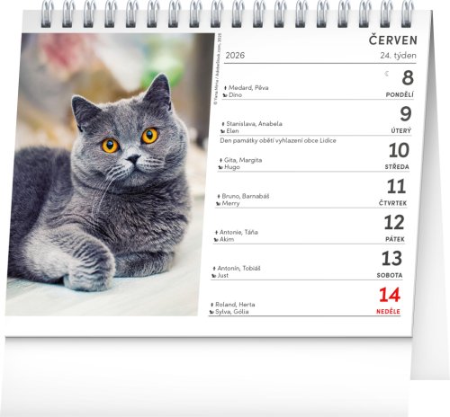 Oslavte svátek spolu se svým kočičím parťákem – v tomto praktickém stolním kalendáři najdete jména koček na každý den. V kalendáři najdete i data mezinárodních výstav koček v Čechách podle FIFe, hezké fotografie a prostor na poznámky.