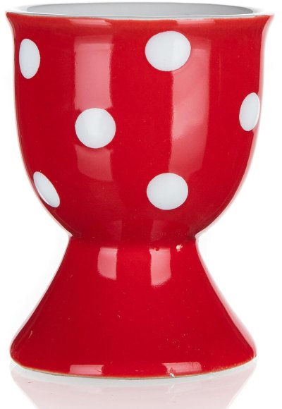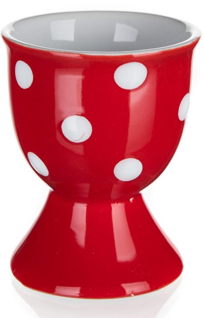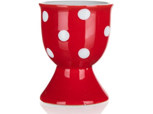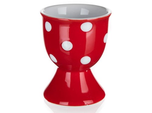 Kalíšek na vajíčko DOTS, v červené barvě s bílými puntíky, je vyrobený z keramiky.