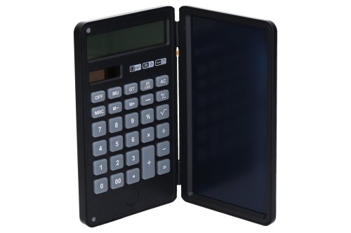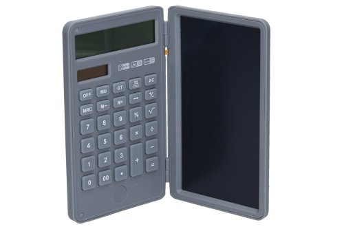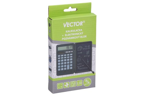 Kalkulačka + elektronický poznámkový blok. Velikost kalkulačky v otevřeném stavu: 18 x 15 cm. Duální napájení - solar + 1x CR2025 baterie. 2 barevné varianty: černá, šedá.