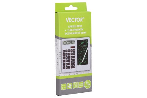 Kalkulačka + elektronický poznámkový blok VECTOR Duální napájení - solar - 1x LR1130 Elektronický poznámkový blok - 1x CR2016 Velikost kalkulačky otevřeném stavu: 15,5 x 16 cm.