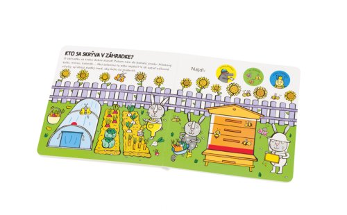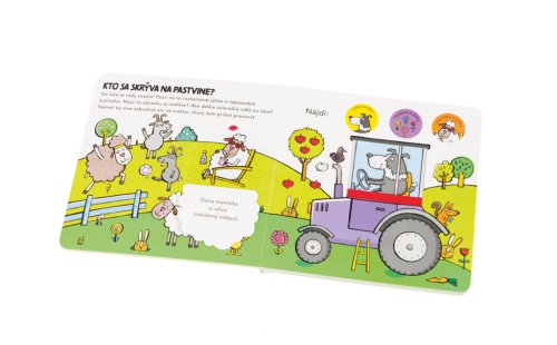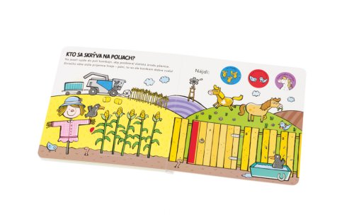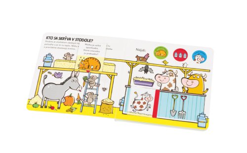 Oblíbený formát leporela s odklápěcími chlopněmi a posuvnými dvířky poskytuje malým čtenářům chytrou zábavu a zároveň utváří jejich představu o tom, jak to vypadá na hospodářském dvoře a co všechno se tam může dít. Práce s takovouto knihou přispívá rovněž ke zlepšování koordinace ruka – oko. Děti tu objevují zvířátka ukrytá ve stodole, na pastvině, na dvorečku, na zahrádce či v polích a řeší jednoduché úkoly zaměřené na rozvoj pozornosti a základních matematických představ.