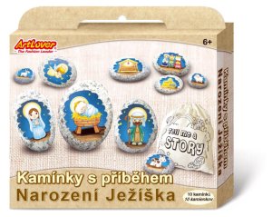 Všechny kamínky nejprve omyj a nech oschnout. Odstraň fólii ze zadní strany přenosové samolepky. Samolepku umísti zadní stranou tam, kde chceš mít obrázek. Pomocí špachtle obrázek přenes na kamínek. Pořádně přitlač a snaž se samolepkou nehýbat. Je-li obrázek přenesen, velmi opatrně snímej již prázdnou část samolepky. Přenesený obrázek ještě jenou opatrně uhlaď. Kamínky jsou hotové! Pokus se podle nich vyprávět příběh o Narození Ježíška. Budeš potřebovat nůžky. Obsahuje: 10 kamínků, 2 archy přenosových samolepek, 1 špachtle, 1 bavlněný sáček. Rozměr krabičky: 19 x 16 x 4 cm Vhodné pro děti od 6 let.