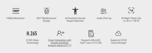 Kamera je navržena pro nepřetržitý venkovní provoz. Díky krytí IP67 zvládne déšť, sníh i extrémní teploty. Obraz i zvuk je možné přenášet živě přes mobilní aplikaci EZVIZ, kde lze také nastavovat detekční zóny a procházet uložené záznamy.