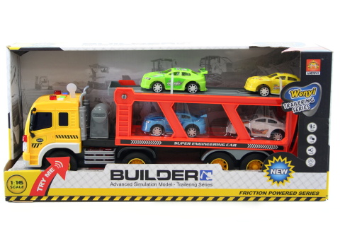 Kamion na baterie (jsou součástí balení). Po stisknutí tlačítek kamion vydává zvuky a svítí. Měřítko 1:16. Obsahuje také 4 plastová autíčka. Rozměry kamionu cca 40 x 12 cm. Věk 3+