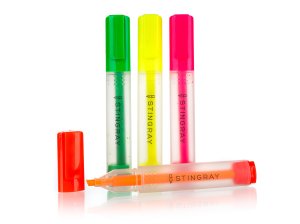 Zvýrazňovač plochý, mix barev (4 ks). šířka linky: 0,5 cm mix barev: žlutá, zelená, růžová, oranžová Sada zvýrazňovačů se zkoseným hrotem.
