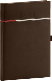 Denní diář Tomy 2026 v hnědo-červené barvě.