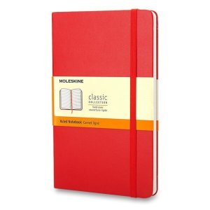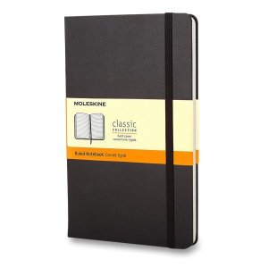 Zápisník s měkkou, ve hřbetu šitou vazbou v kartonových deskách, obepnutý pružnou páskou proti samovolnému otevírání.
