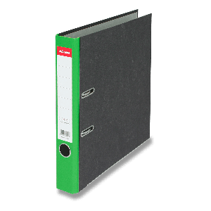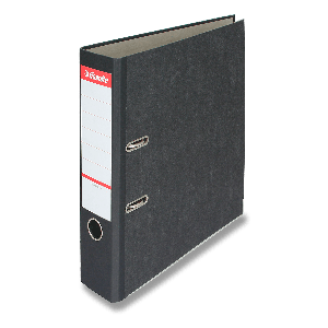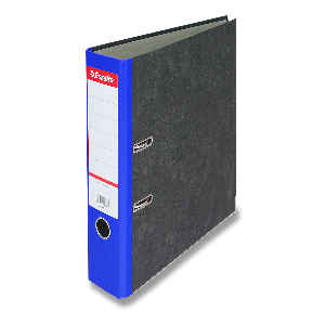 Kartonový pákový pořadač potažený mramorovaným papírem z vnitřní i vnější strany.