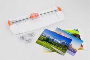 - rotační nůž z tvrzené oceli - transparentní přítlačné pravítko - hliníková řezací plocha a vodící lišta - předtištěné formáty pro klasické i digitální foto, DIN formáty, CD a DVD - úhel pro šikmý řez …