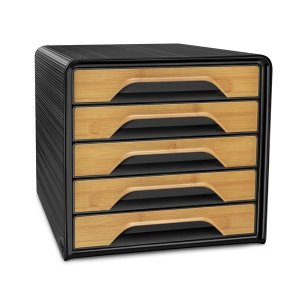 Zásuvkový box KARMA s 5 zásuvkami na papír formátu DIN A4 a větší oceněný ekologickým certifikátem "BLUE ANGEL" Zásuvky mají zarážku proti vytažení a otvor s rukojetí pro snadné vyjmutí Vnější výška …