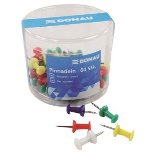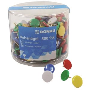 Připínáčky k upevnění dokumentů, v plastové dóze Provedení: tvar válečku Balení: 25 ks Barva: barevný mix