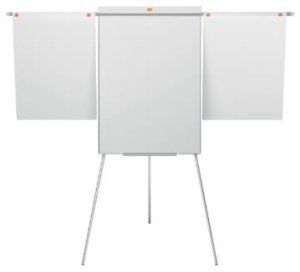 "Flipchart s ocelovou magnetickou tabulí pro suché mazání, umístěný na trojnohém stativu, s integrovanou poličkou na fixy a dvěma výsuvnými rameny, užitečnými při potřebě zobrazit další stránky.