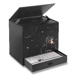 Sada Moleskine Le Petit Prince v limitované edici obsahuje černý linkovaný zápisník velikosti L, nedatovaný týdenní diář velikosti L a sběratelskou postavičku Malého Prince v dárkovém boxu.