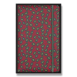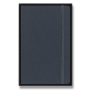 Zápisník s měkkou, ve hřbetu šitou vazbou v kartonových deskách, obepnutý pružnou páskou proti samovolnému otevírání.