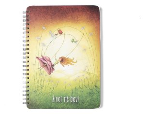 Edice Duhová kočka, formát A5, čistý (bez linek), 50 listů, kroužková TWIN WIRE vazba, speciální knižní papír (Holmen book), motiv Život mě baví. br brPoznámkové bloky z edice Duhová kočka vznikly spoluprací …
