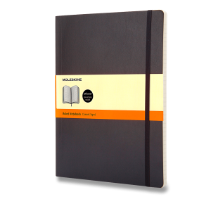 Zápisník s měkkou, ve hřbetu šitou vazbou v kartonových deskách, obepnutý pružnou páskou proti samovolnému otevírání.