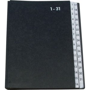 Stolní organizér, materiál - ražený karton, pružný hřbet, vnitřní listy s děrováním, jednostranný potisk formát-A4, rozlišení-1-31, barva-černá