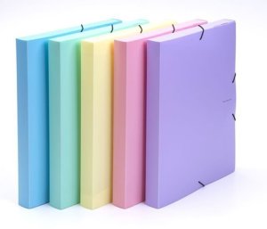 Archivační box Pastelini v moderních pastelových barvách pro dokumenty ve formátu A4, se zajišťovací gumičkou.