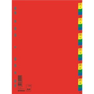 Papírové rozlišovače, vhodné pro organizaci a kategorizaci dokumentů v pořadači Počet kusů v balení: 20 (číslováno 1 - 20), barevné (2 x 10 barev) Počet děr: 11 Tloušťka materálu: 170g Formát: A4