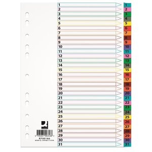 Bílý s šedými okraji a čísly Materiál polypropylen Počet děr: 11 Formát A4 Rejstřík 1-31 Rozměry:22,5 x 29,7 cm (š x v)