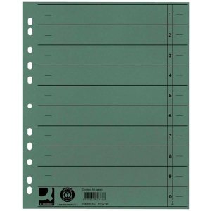 Papírové rozlišovače značky Q-Connect v zelené barvě pro přehledné třídění dokumentů Materiál: karton Gramáž materiálu: 190 g/m2 Formát: 1/3 A4 (240 x 105 mm) Počet kusů v balení: 100 ks Barva: zelená