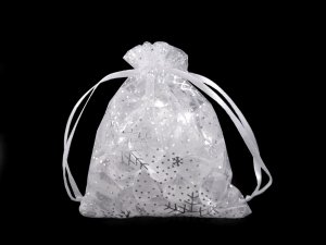Dárkový pytlíček je vyrobený z organzy a zdobí ho sněhové vločky.