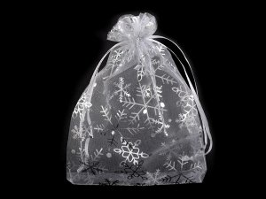 Dárkový pytlíček je vyrobený z organzy a zdobí ho sněhové vločky.