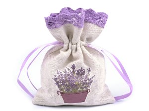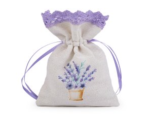 Plátěný dárkový pytlík je ozdobený potiskem květů levandule. [Plátno má hrubší strukturu, která působí jako imitace juty.] Nahoře je olemovaný paličkovanou krajkou.