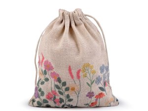 Lněný pytlík zdobí z jedné strany potisk stylizovaných květů.