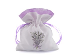 Plátěný dárkový pytlík je ozdobený potiskem květů levandule.