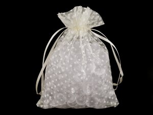 Dárkový pytlík z organzy zdobí potisk puntíků.