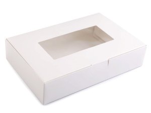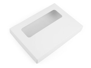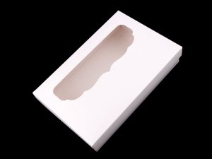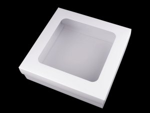 Obdélníková papírová krabice má výřez ve víku z průhledné fólie. [Povrch bílé krabice je lesklý].