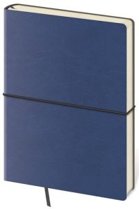 Zápisník s měkkou, ve hřbetu šitou vazbou v kartonových deskách, obepnutý pružnou páskou proti samovolnému otevírání.