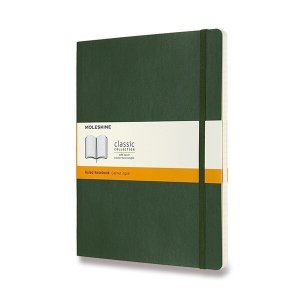Zápisník s měkkou, ve hřbetu šitou vazbou v kartonových deskách, obepnutý pružnou páskou proti samovolnému otevírání.
